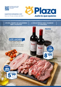supermercadosplaza.com 1 Justo loque quieres Del 2 al 15 de octubre de 2025 Descárgate nuestro folleto para consultarlo siempre que quieras. supermercadosplaza.com PROTOS Vino tinto roble D.O. Ribera del Duero 75 cl OTOÑO, TIEMPO DE LEGUMBRES BIEN CALENTITAS 6 VINOS TINTOS PARA CELEBRAR LA VENDIMIA LOTE AHORRO . 3 KG CERDO FRESCO - 1 kg filetes de cerdo - 1 kg de chuletas de aguja - 1 kg de carne para guisar 5’99 17,97 €/lote 9,99 € -40% descuento EL KILO SALE A 8’05 10,73€/l 8,95 € -10% descuento